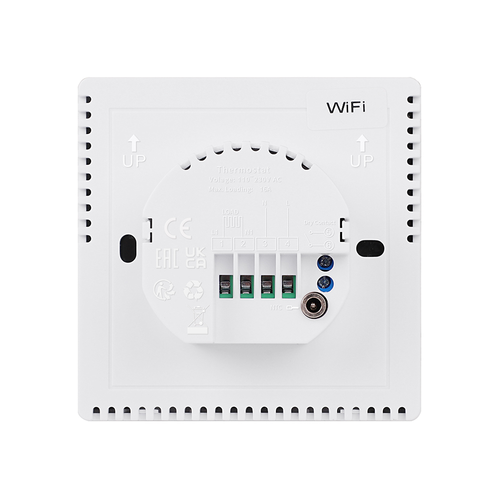 Self-Power Consumption: < 1W Display: LCD Load Power: < 3000W Temperature Display Range: 0~99℃ Wireless Communication: 2.4G WiFi / Zigbee (Tuya) Humidity Display Range: 0~99% Rated Voltage: AC 110~230V Housing: PC+ABS Flame-RetardantRated Frequency: 50Hz~60Hz Dimension: 86*86*15.5mm Temperature Sensor: NTC Thermistor 3950 10K Mounting Hole Distance: 60mm (Standard) Operating Environment Humidity: 5~95%RH (Non-condensing) Operating Environment Temperature: 0℃~50℃